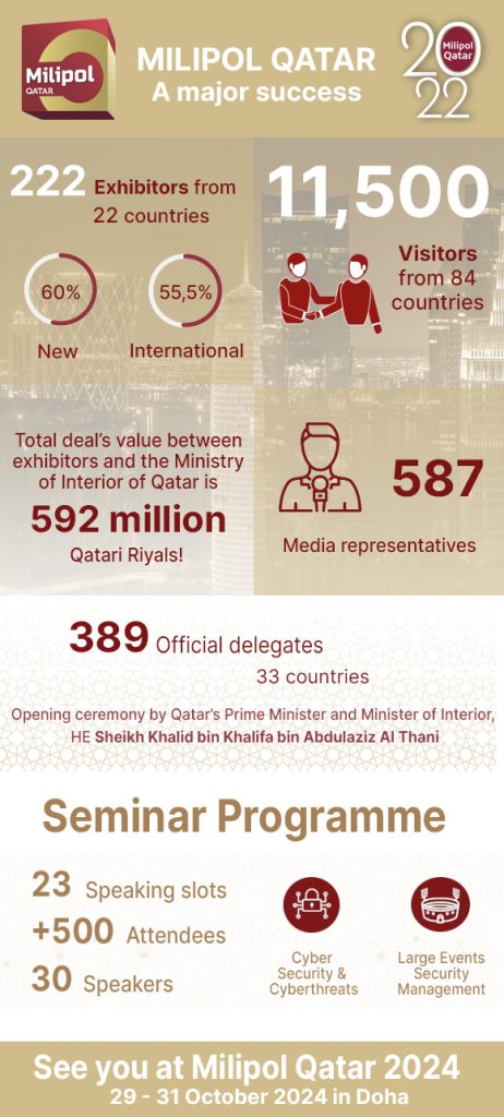 Held against a background of rising homeland and civil defence expenditures in the region, Milipol Qatar 2022, which spanned over 11,000 square metres of exhibition space, had a record visitor turnout of over 11,500 and the declared on-site sales topped QAR 592 million.